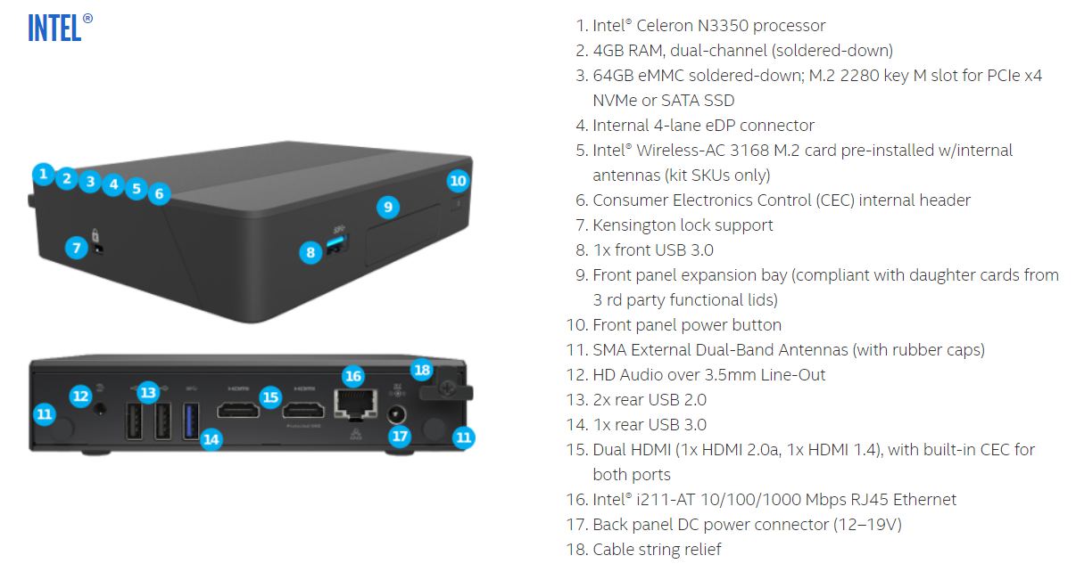 Intel Rugged Kit NUC8CCHKR Mini PC NUC - Intel Celeron Processor N3350 (2M Cache, up to 2.4 GHz), 4GB LPDDR3 (dual-channel, soldered-down),ความจุ 64GB eMMC, 2x HDMI ,Industrial Grade (รองรับ M.2 SATA/NVMe 2280) Key Specifications