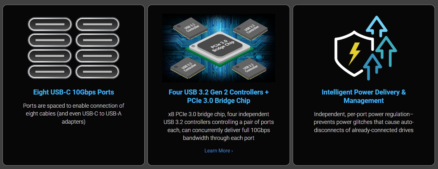 8-port, USB-C 10Gbps (USB 3.2 Gen 2) PCIe Card with Four USB Controllers Plus USB-C Charging