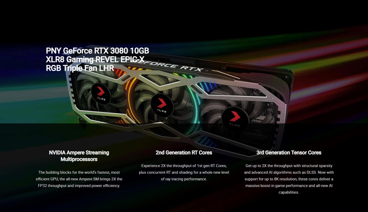 PNY GeForce RTX3080 10GB XLR8 Gaming REVEL EPIC-X RGB Triple Fan LHR - VCG308010LTFXPPB - 3Y WarrantyThe GeForce RTX™ 3080 delivers the ultra performance that gamers crave, powered by Ampere—NVIDIA’s 2nd gen RTX architecture. It’s built with enhanced RT Cores and Tensor Cores, new streaming multiprocessors, and superfast G6X memory for an amazing gaming experience.