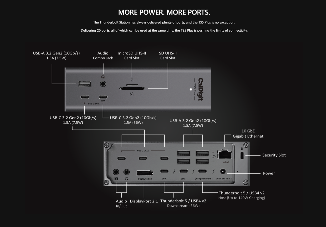 CalDigit TS5 plus Thunderbolt Station 5 + 1.0m TBT5 cable หมายเหตุ ตัวสินค้ามีสาย Thunderbolt 5 มาให้จำนวน 1 เส้น ความยาว 1.0m**